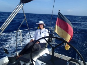 Sailing impression from the Atlantic with moderate waves. A relaxing way to get to Bermudas. During the day, the three of us took the position at the helm as it comes. Quite easy doing with the autopilot in gear. Here: Larry at the wheel.